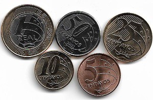 Uma moeda de cada valor R$1,00 / R$ 0,50 / R$ 0,25 / R$0,10 e R$0,05